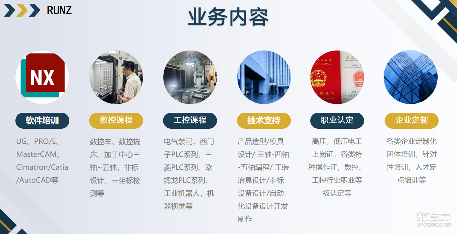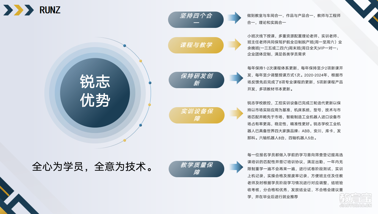无锡市新吴区锐志职业培训学校,是一所由无锡市新吴区人社局审批设立的,专业培养数控和电气自动化技术人才的民办职业培训学校。锐志初始成立于2006年,一直坚持“锐意进取、精益求精”办学理念,学校借鉴在世界著称的德国技师培训模式,注重理论与实践并行,紧密贴合市场岗位需求,实行小班面授、理论+实践、企校合一的培训方式,为社会培养输送了大量的技能储备人才。学校目前占地面积几千平方,包含智能制造综合实训区近千平方、数控实训车间近两千平方,教工组由23位经验丰富的技术老师组成,其中全职技师4位,高级技师3位,工程师3位,高级工11位,保障了高质量的教学质量开,设了12个专业课程,涵盖数控加工(二轴-五轴)、模具设计、编程、电工、非标自动化(电气),工业机器人以及机器视觉等培训项目,已累计服务企业和院校218家次,培训各类数控和电气自动化技能人才20000多人次